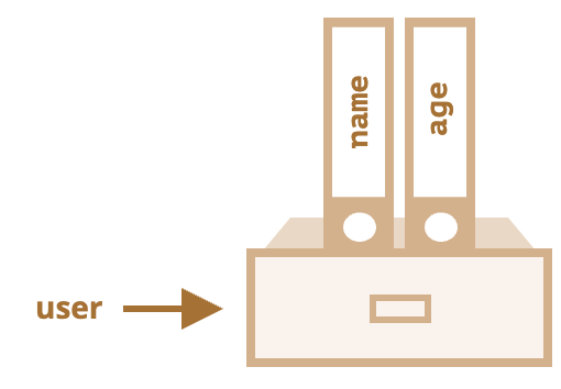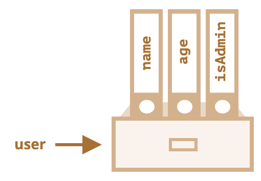 서랍장(객체 user) 안에 파일 두 개(프로퍼티 두 개)가 담겨있는데, 각 파일에 “name”, "age"라는 이름표가 붙어있다고 생각하면 쉽다. 또한 프로퍼티 값엔 모든 자료형이 올 수 있으며 삭제 또한 가능하다.