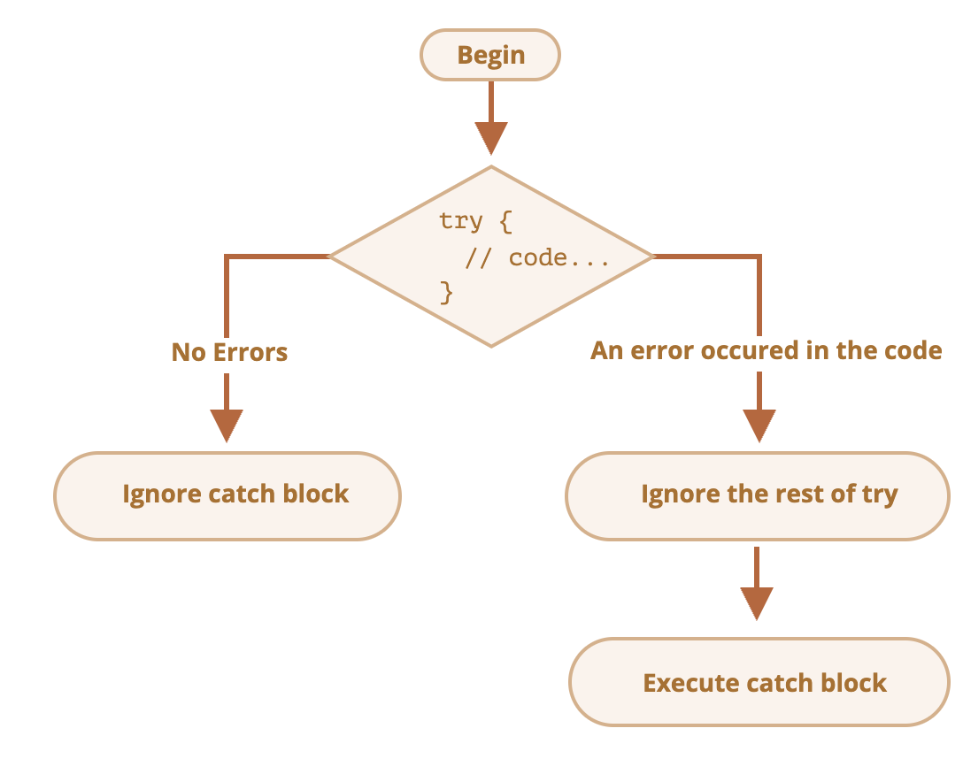 - 에러가 없다면, try 안의 마지막 줄까지 실행되고, catch 블록은 건너뛴다.