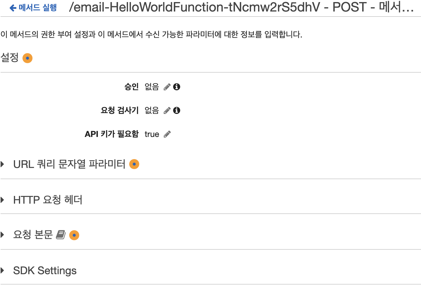 이런 식으로 메소드를 any에서 POST로 바꾸고 API 키가 필요함을 true로 바꿔주고 사용량 계획을 추가해서 거기에 발급받은 apikey를 붙였다.