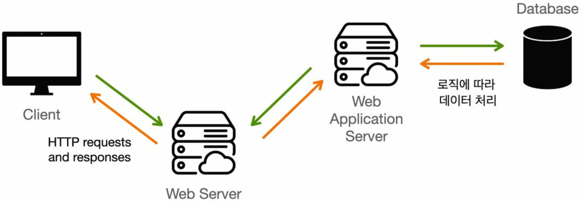 웹서버는 보통 HTTP 요청과 응답만을 처리하고, 다음 그림과 같이 클라이언트와 웹서버 간에 상호작용이 이루어진다.