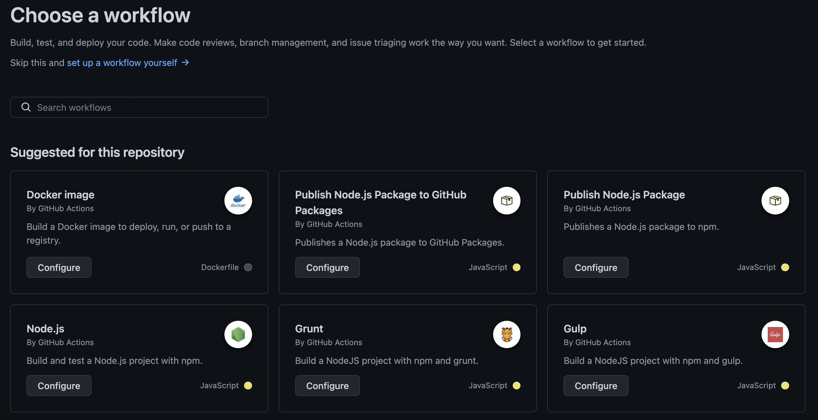 포크한 레포지에서 깃허브 액션으로 들어가보니 workflow를 고르는 창이 떴고 node.js를 골랐다.