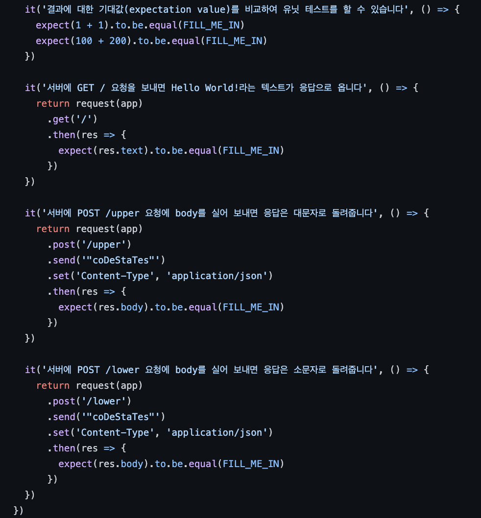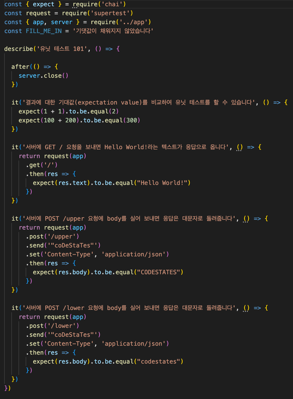 처음에 딱 봤을 때 이걸 어떻게 하라는거지 싶었지만 천천히 보니 (1+1).to.be.equal(FILL_ME_IN) 값을 보니 어? 그냥 2를 넣으면 되는거 아닌가 싶어 넣어보니 테스트를 통과했고 그 뒤부터는 쉽게 쉽게 채워 나갔다.