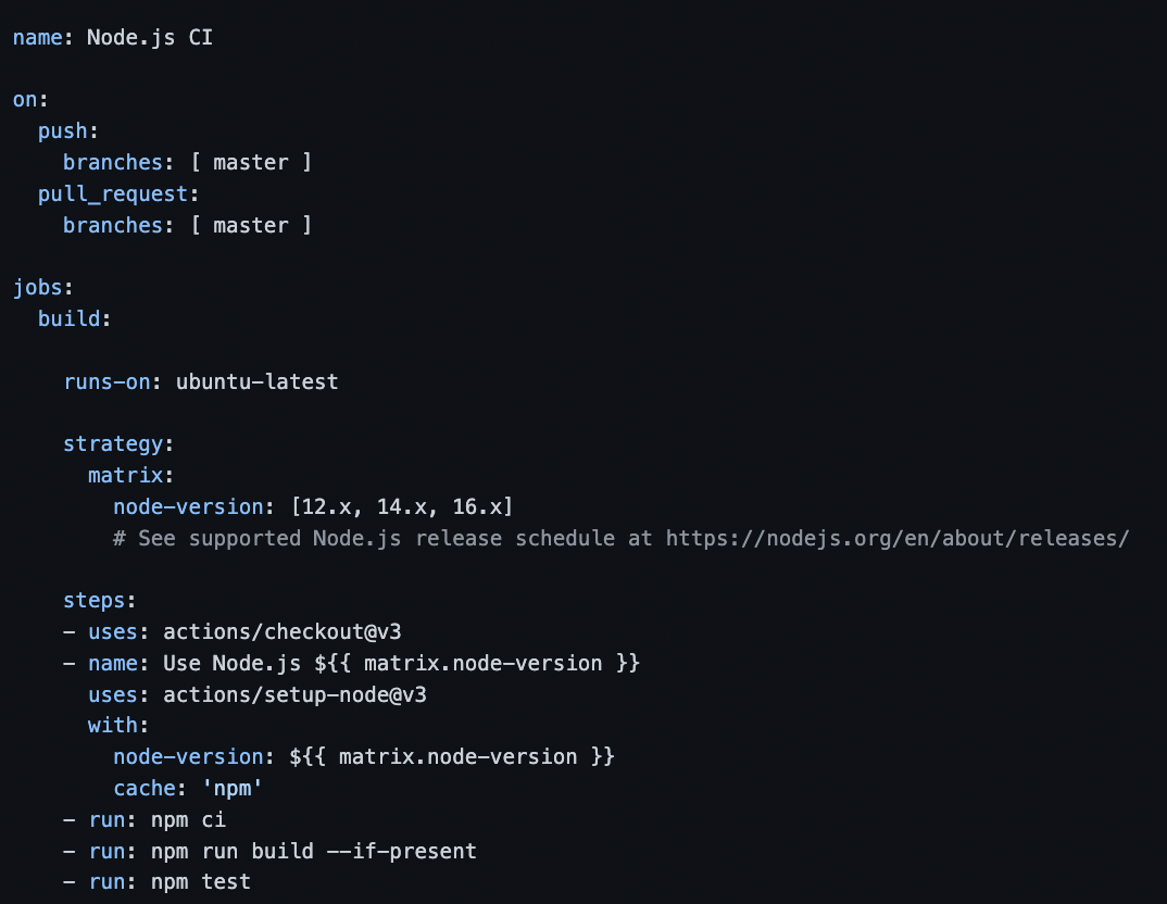 이렇게 yaml 파일을 다 작성해주었고 여기서 16버전으로 지정하라 했으니 [12.x, 14.x, 16.x]에서 16.x만 남기고 다 지우고 start commit을 누르니 알아서 빌드와 테스트를 하고 성공했다.