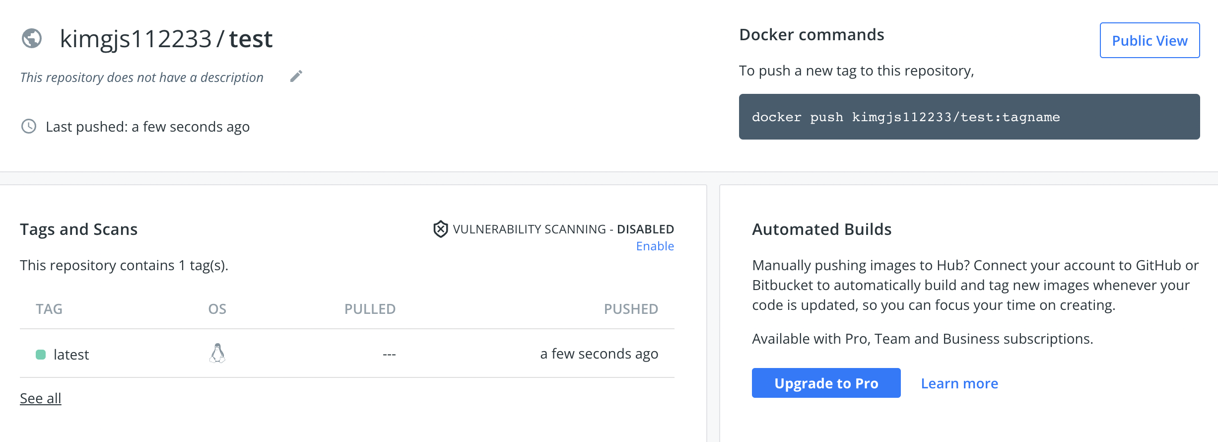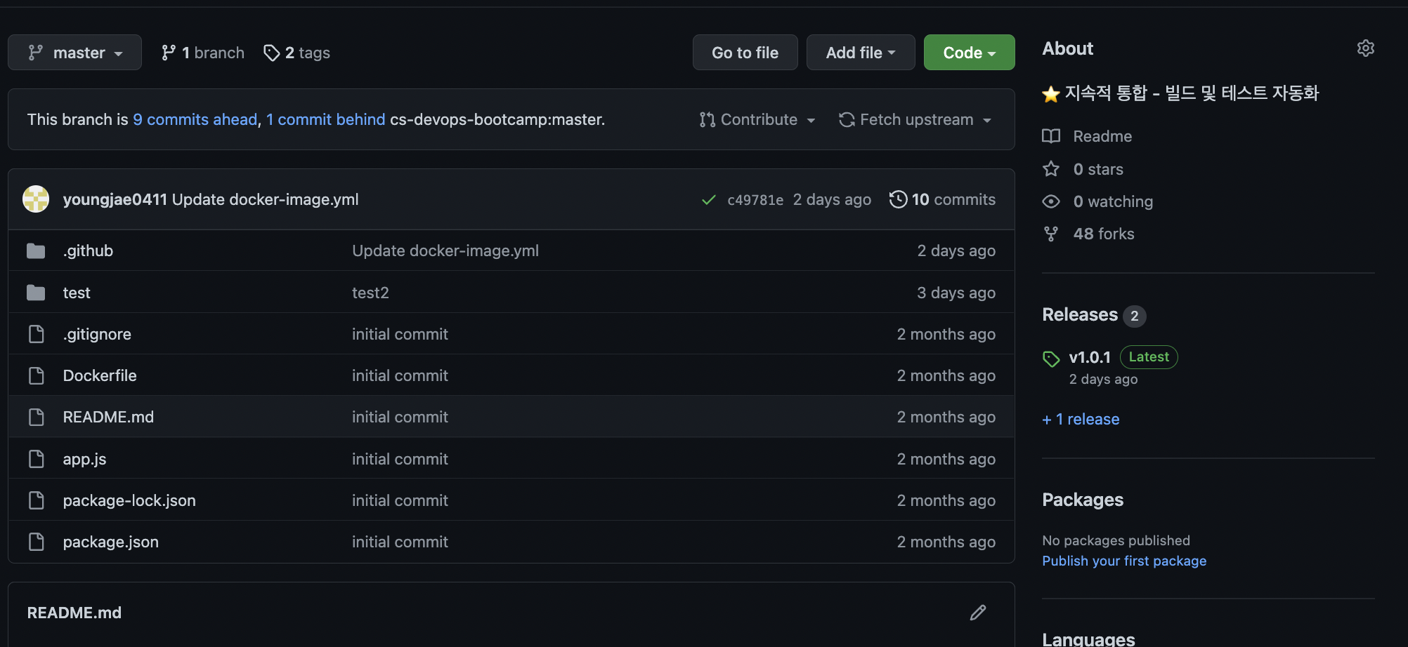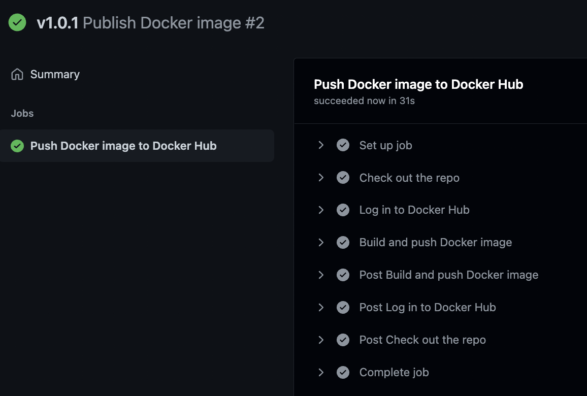 yaml파일의 태그 부분을 수정하고 새로운 버젼으로 릴리즈를 해야 변경사항이 적용되는데 난 변경 사항이 적용이 되어있지않은 곳에 자꾸만 테스트를 했으니 같은 오류가 났던 것이다. 그래서 새롭게 릴리즈를 하고 테스트를 하니 잘 해결되었고 도커허브에도 잘 푸쉬 되는 것을 볼 수 있었다.