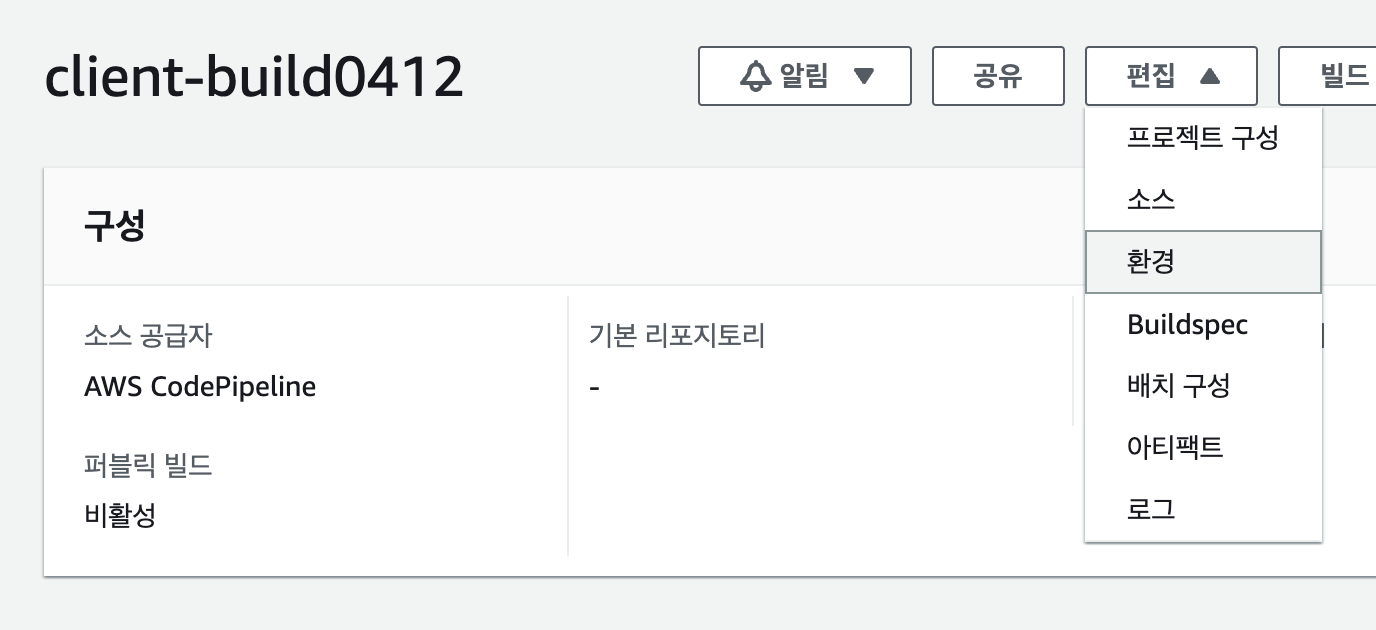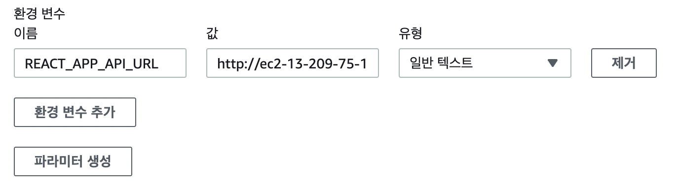 그 후 빌드에 들어가 편집 - 환경 - 추가 구성 - 환경 변수에 값을 넣어줬다. 빌드는 클라이언트이기때문에 서버와 이어줘야하기때문에 환경변수처리한 REACT_APP_API_URL에 ec2ip 값을 넣어줬다.