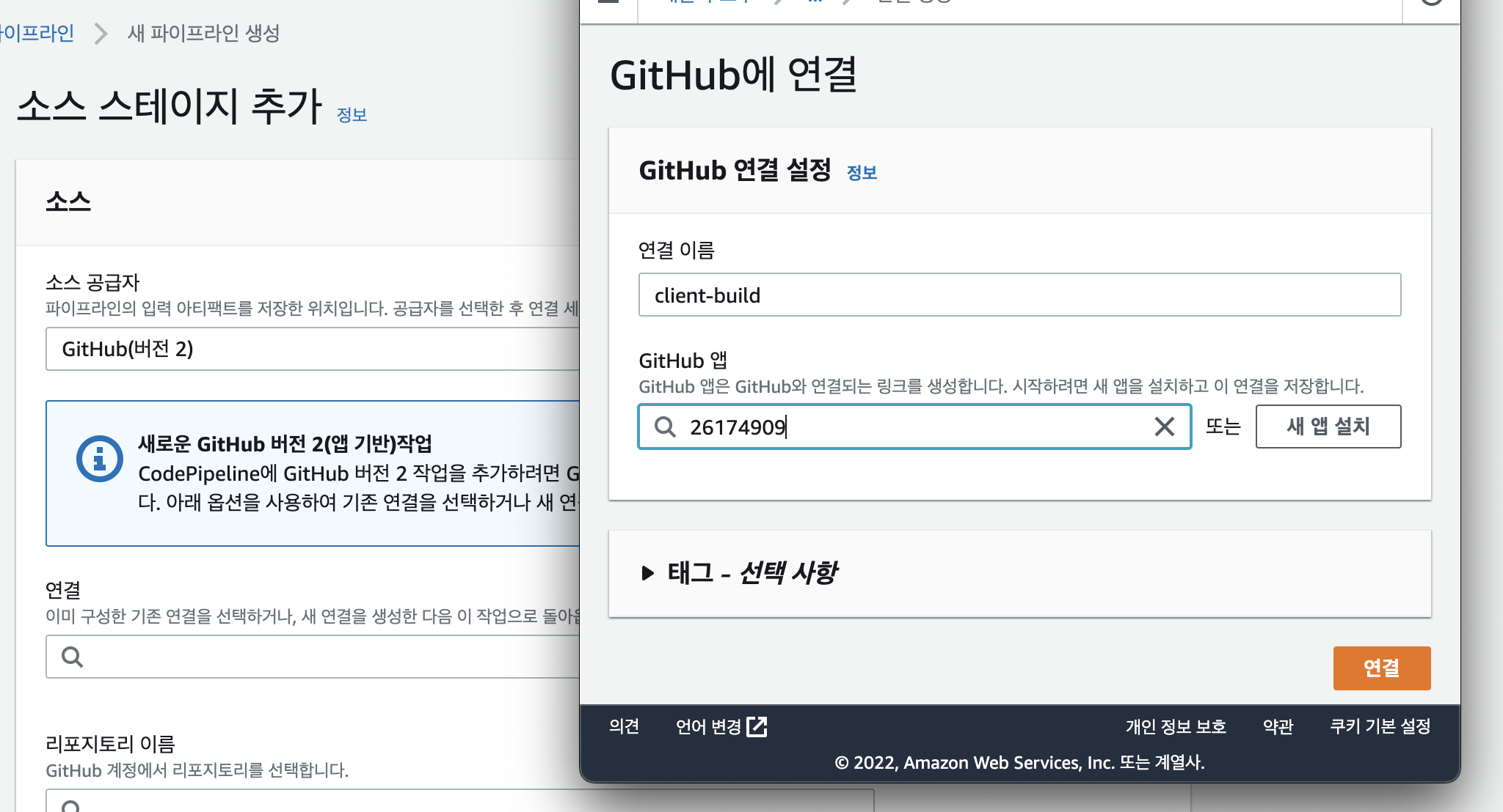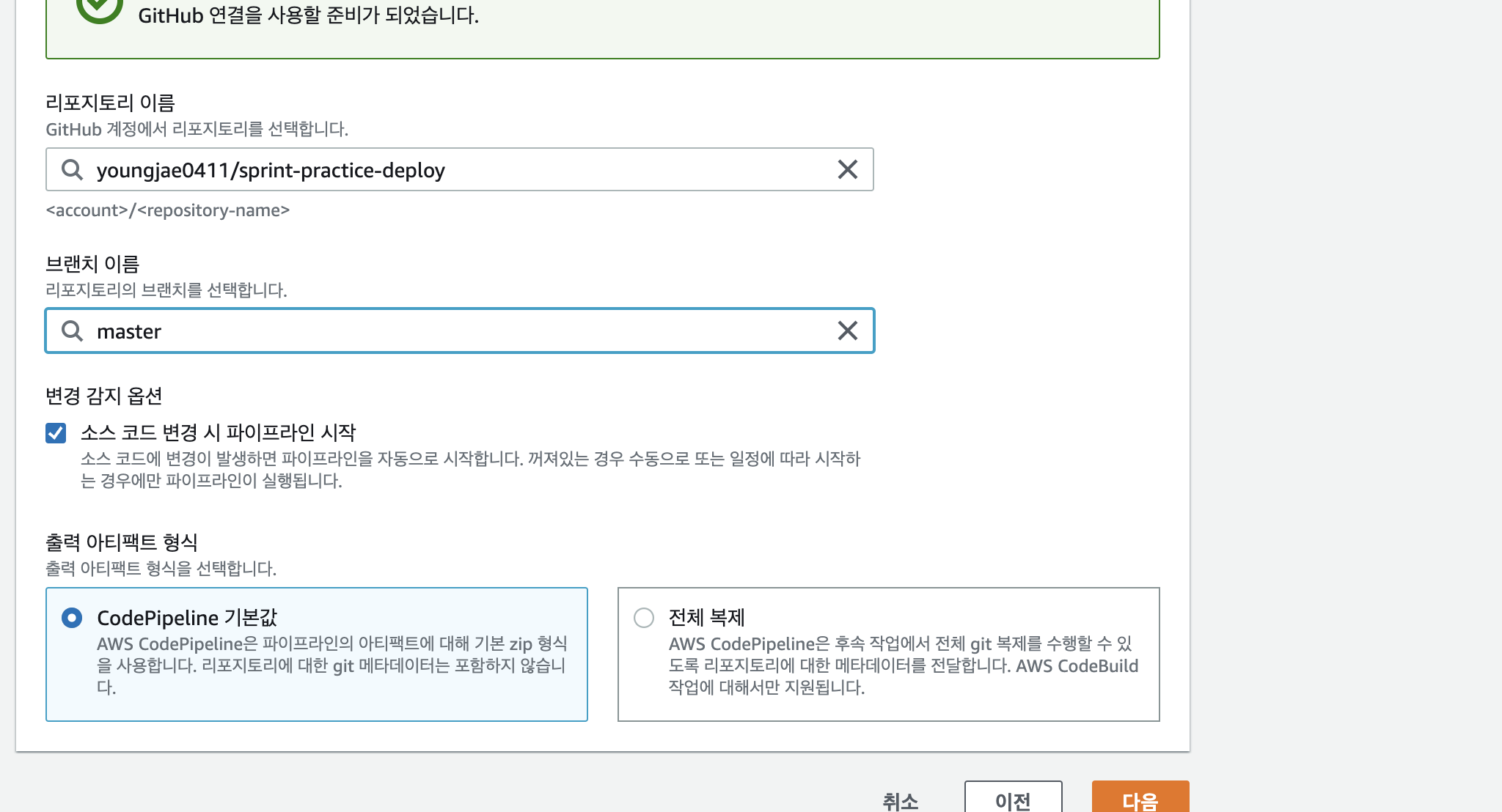 - Source 단계에서 소스 코드가 저장된 GitHub 리포지토리를 연결합니다.