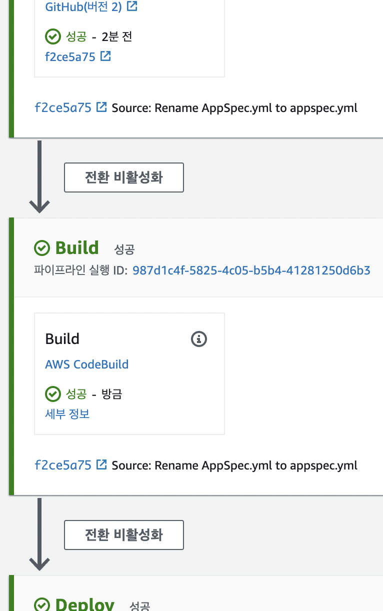 그 후 배포는 s3로 설정하고 파이프라인을 돌리면 이와 같이 자동화가 된 걸 볼 수 있다.