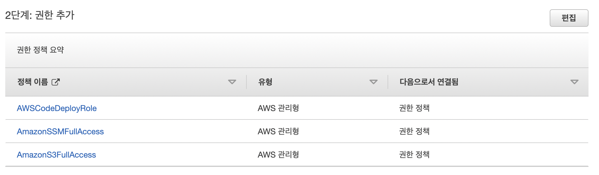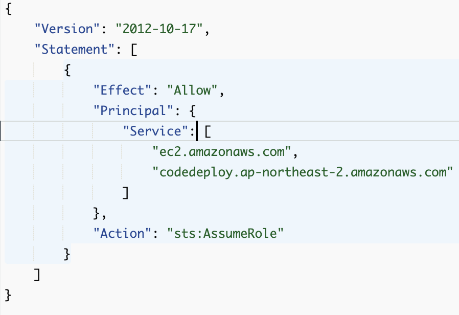 먼저 IAM설정 하는데 위 그럼과 같이 설정하면 된다. 권한에는 s3와 ssm(AWS Systems Manager)는 풀 엑세스, code deploy는 Role권한만 준 후 신뢰관계에 들어가 codedeploy.ap-northeast-2.amazonaws.com도 넣어줘 권한을 열어준다.
