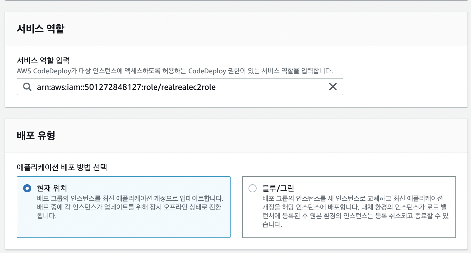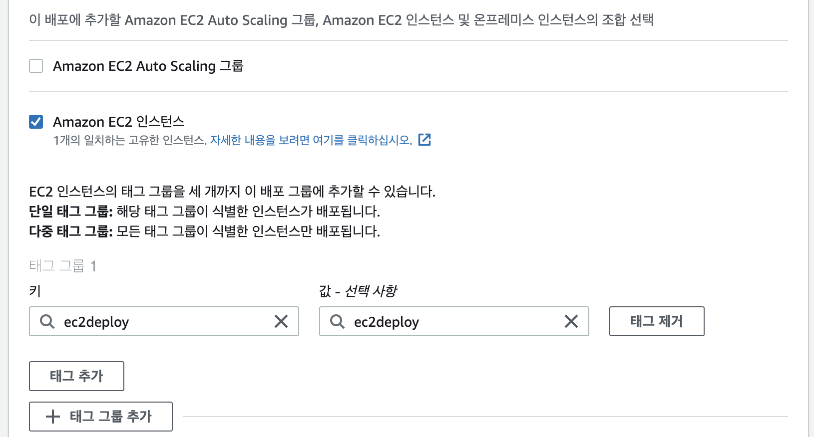 애플리케이션을 만든 후 배포그룹을 만드는데 서비스 역할은 아까 만들었던 IAM을 고르고 키 값은 아까 만들었던 태그값을 넣으면 된다.
