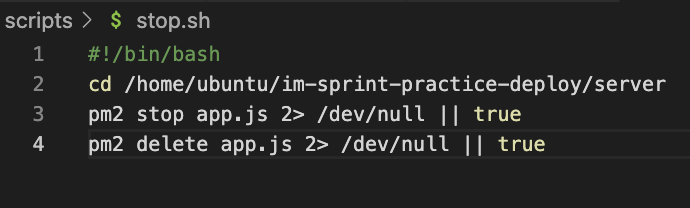 배포하기전 먼저 스탑을 해야하기때문에 stop.sh에는 서버를 멈추는 코드가 들어가있고 initialize.sh에는 필요한걸 instatll한다.