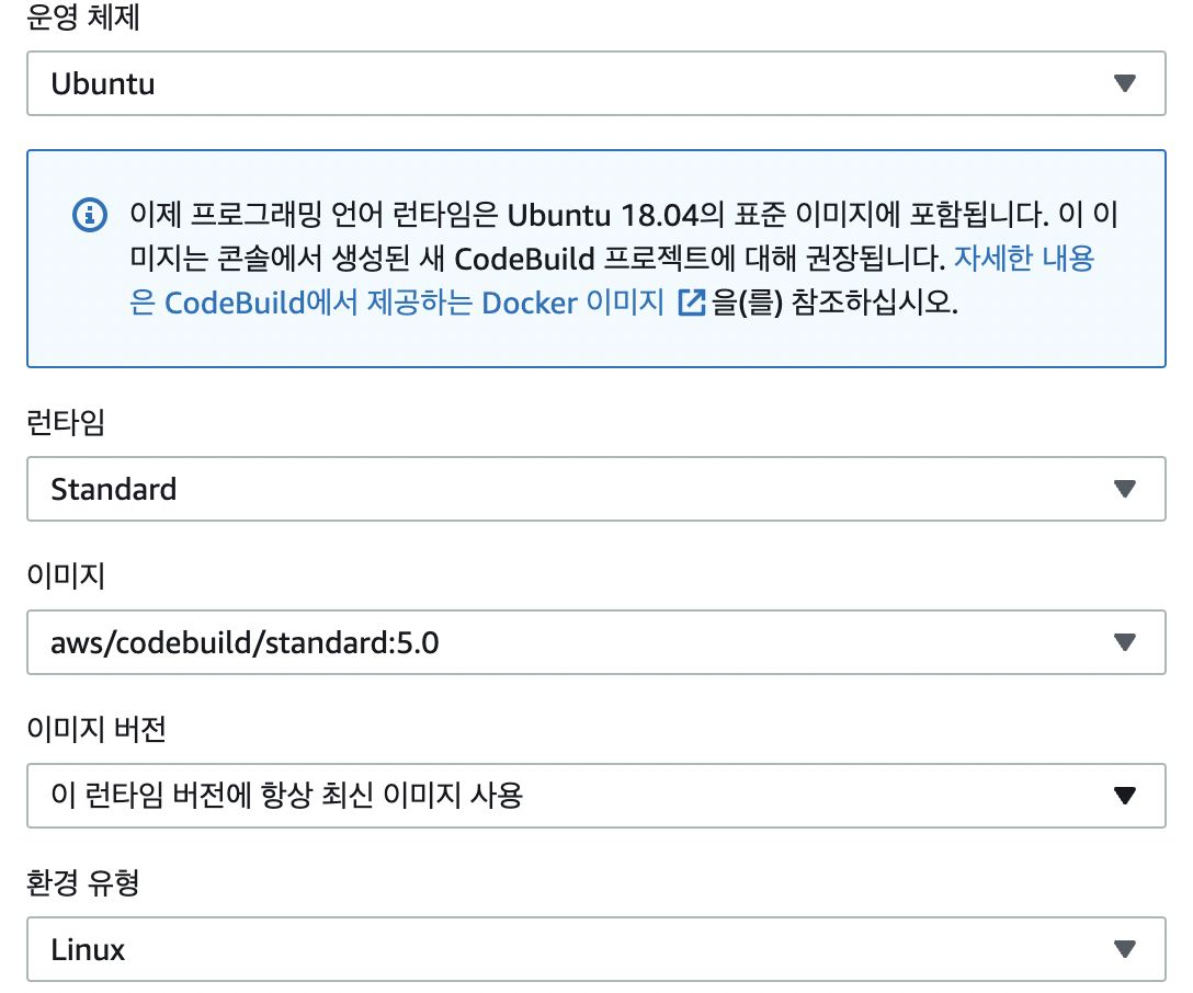 그 후 빌드를 만들어 프로젝트를 설정하는데 여기서 고르는 건 도커 이미지이다. 빌드를 할려면 node.js 이런것들이 깔아져있어야하므로 aws에서 미리 깔아둔 이미지를 골라 빌드하는 것이다.