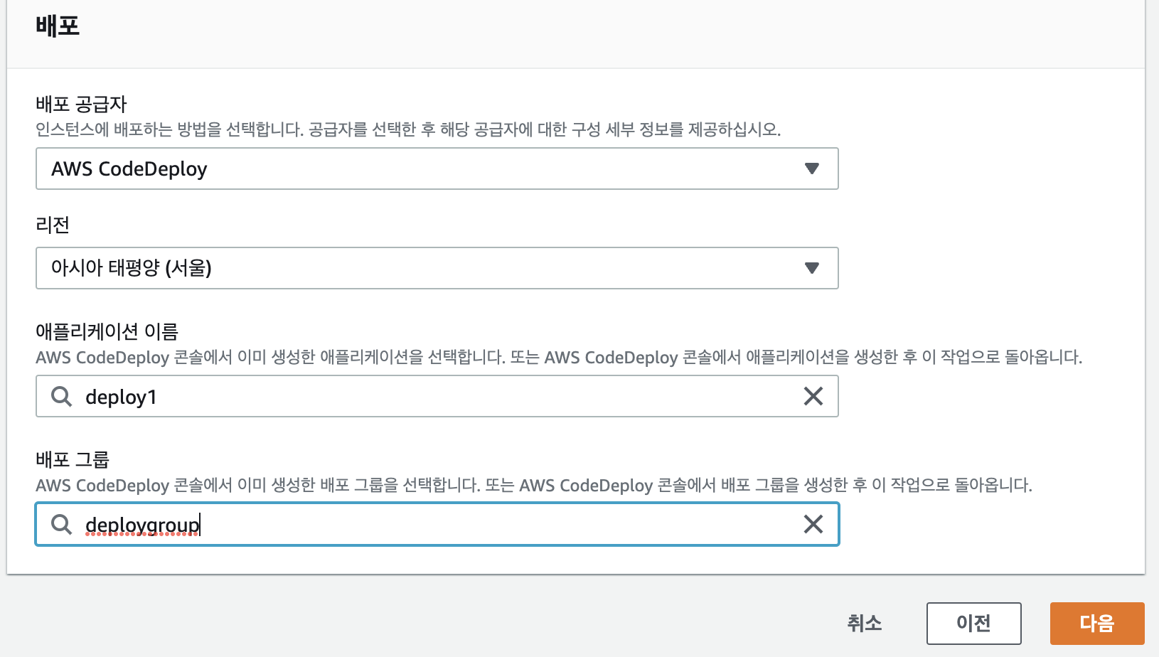 그 후 배포 공급자는 code deploy, 애플리케이션 이름과 배포 그룹은 만든 애플리케이션과 배포 그룹을 넣으면 배포도 완료다.