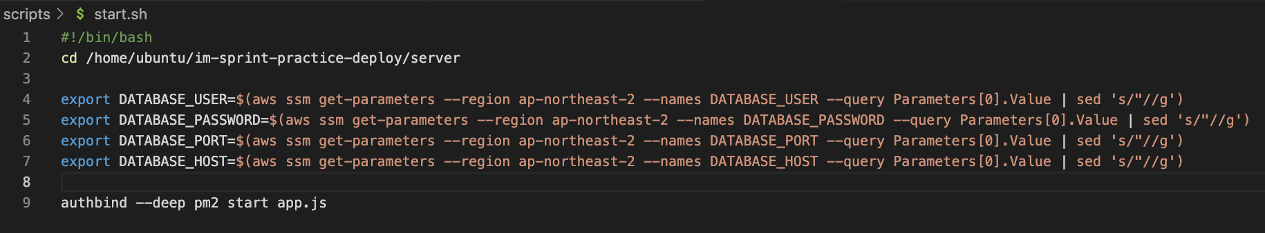 위 그림과 같이 rds의 정보를 여기에 넣어주고 저 변수값을 시작할 때 넣어줘야하기때문에 start.sh에 코드를 변경해준다.