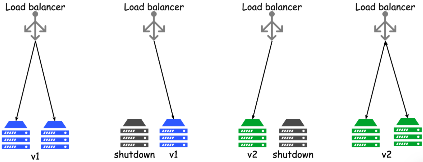 Blue가 실제 운영중인 환경일때 새로운 버전을 릴리즈 하고 싶은 경우 Green 환경에서 테스트를 진행한다. 테스트가 정상완료되면 Blue 환경에 들어가던 모든 요청을 Green 환경으로 변경한다.