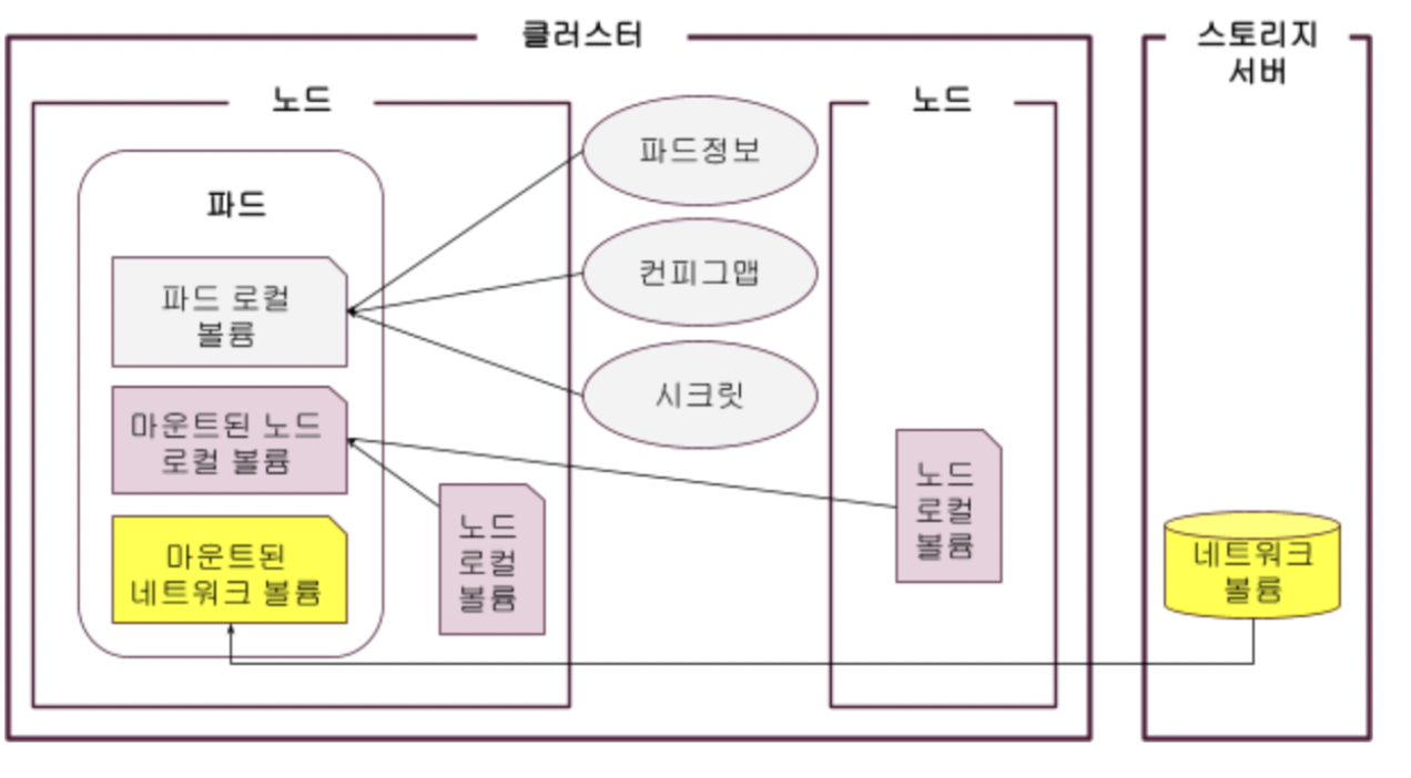 볼륨을 크게 나누면 파드 로컬 볼륨, 노드 로컬 볼륨, 네트워크 볼륨으로 나눌 수 있으며 이는 공식적인 것이 아닌 이해를 돕기 위해 임의적으로 나눈 분류이다. 파드 로컬 볼륨은 파드 안에만 만들어지는 볼륨이고 노드 로컬 볼륨은 쿠버네티스 클러스터 노드의 볼륨이며 네트워크 볼륨은 클러스터 외부에 존재하는 볼륨이다.