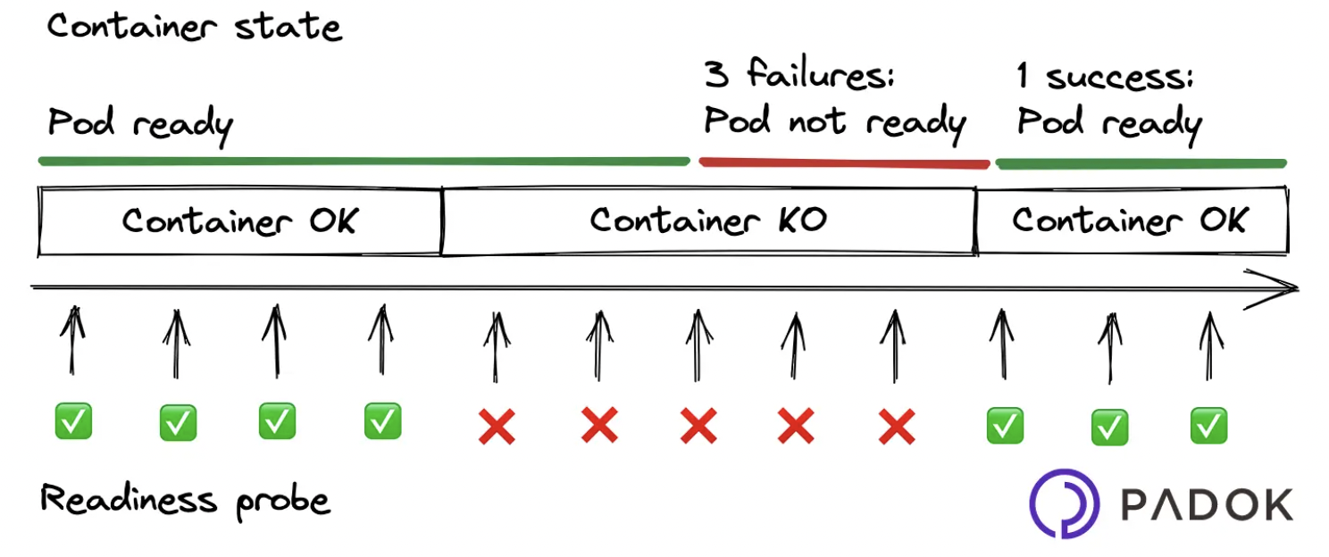 Readiniess probe는 컨테이너가 새 요청에 응답을 할 준비가 되었는지를 확인하며 Liveness Probe와 달리 Readiniess Probe는 컨테이너를 종료하지 않는다. Kubernetes는 해당 서비스에서 컨테이너의 포드를 제외시키며 트래픽이 리디렉션되지 않도록 한다. 또한 Readionsee Probe가 성공해야 트래픽을 보내기 시작한다.