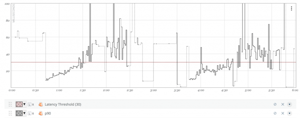 백분위수 메트릭을 사용하면 몇 시간 또는 몇 주에 대해 공식화된 정확한 서비스 수준 목표를 구현할 수 없습니다. 5분(또는 이와 유사한) 간격으로 백분위수를 저장하는 오픈 소스 및 상업용 시계열 데이터 모니터링 시스템이 상당히 많이 있습니다. 그러나 백분위수는 그래프의 시간 창에 있는 픽셀 수에 맞게 평균을 냈고 평균 데이터는 수학적으로 잘못되었습니다.