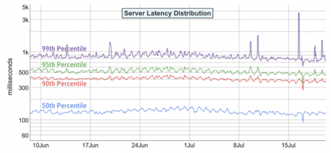 위 이미지는 서버 지연시간 분포를 측정하기 위해 사용되는 일반적인 그래프입니다. 6월 초부터 7월 말까지 두 달 동안 진행되며 여기의 모든 픽셀은 하나의 값을 나타냅니다. 50번째 백분위수 또는 평균은 요청의 약 절반(파란색 선 아래에 있는 요청)이 약 140밀리초보다 빠르게 제공되었고 약 절반은 140밀리초보다 느리게 제공되었음을 의미한다.