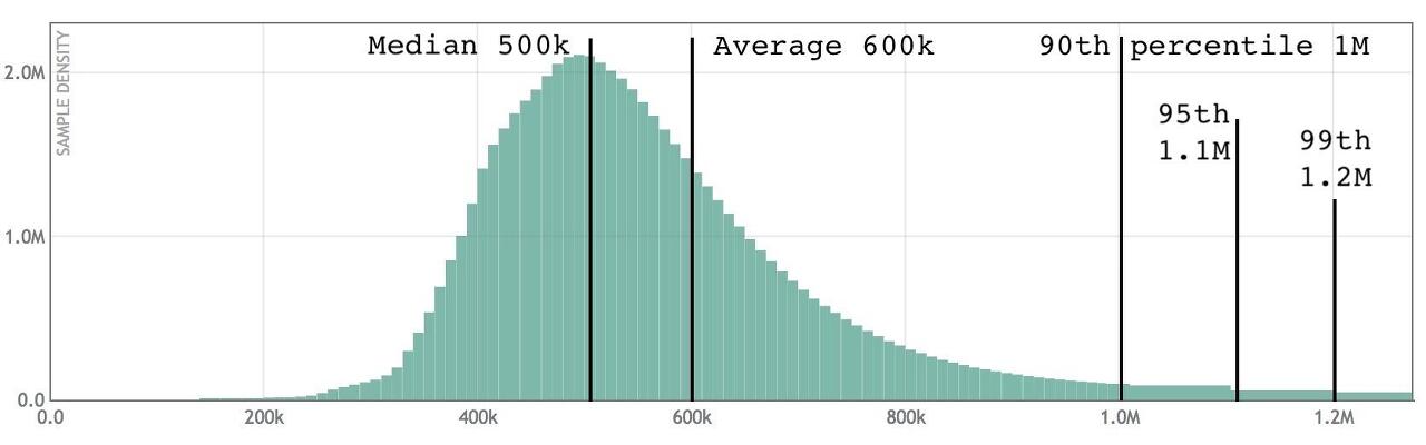 위의 이 히스토그램에는 특정 대기 시간 분포(총 6백만 개의 대기 시간 샘플)에 대해 제공된 모든 단일 샘플이 포함됩니다. 예를 들어, 100만 개의 샘플이 370,000~380,000마이크로초 범위에 속하며 대기 시간 샘플의 99%가 120만 마이크로초보다 빠릅니다. 이 모든 샘플을 600바이트로 저장할 수 있고 백분위수와 역 백분위수를 정확하게 계산할 수 있으며 저장, 분석 및 회수 비용이 매우 저렴합니다.
